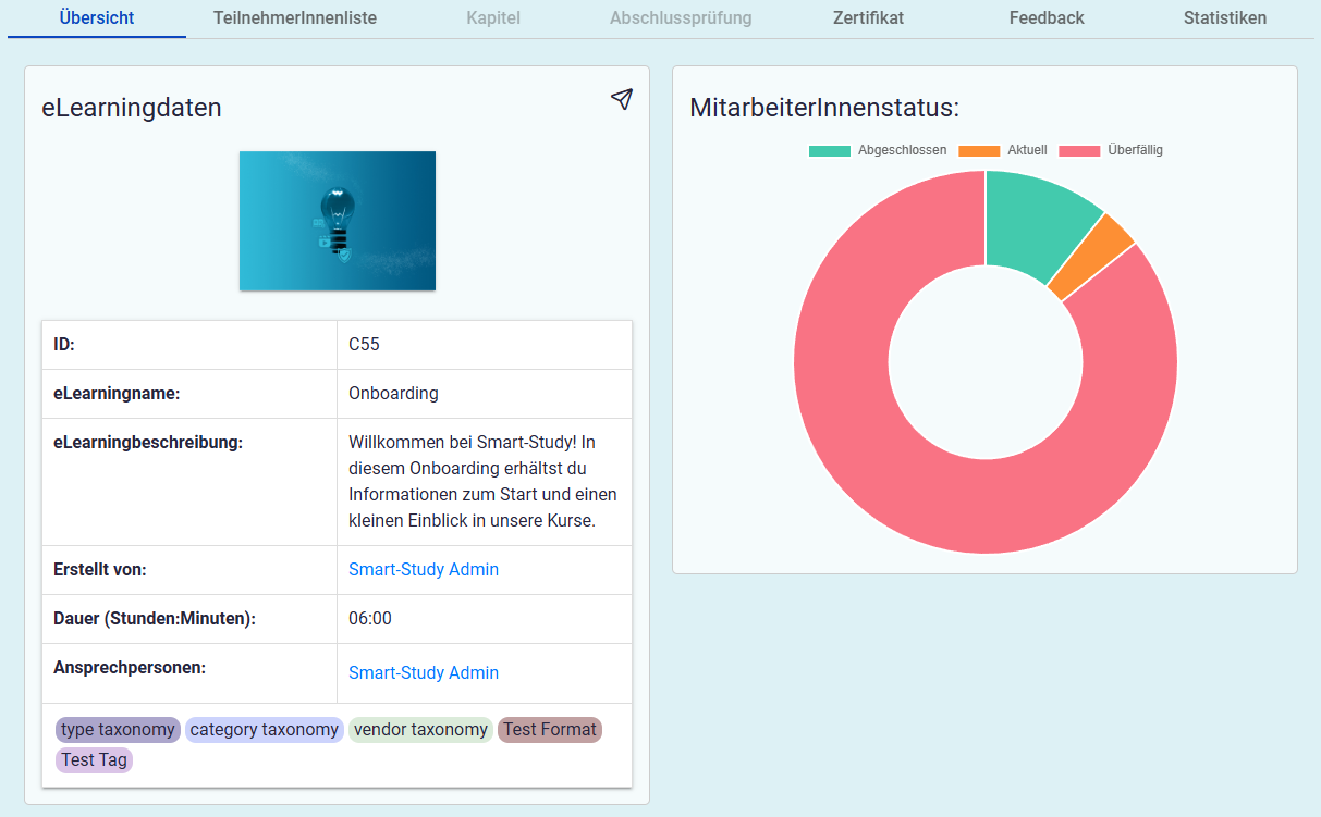Das Kursprofil beginnt mit dem Menüpunkt Übersicht. Auf den ersten Blick erhalten Sie hier die Kursdaten: Das Bild des Kurses, der Name, die Beschreibung und die Fortbildungserstellenden. Daneben sehen Sie den MitarbeiterInnenstatus, der wie gewohnt farblich codiert ist und den Status aller Kursteilnehmenden zeigt.