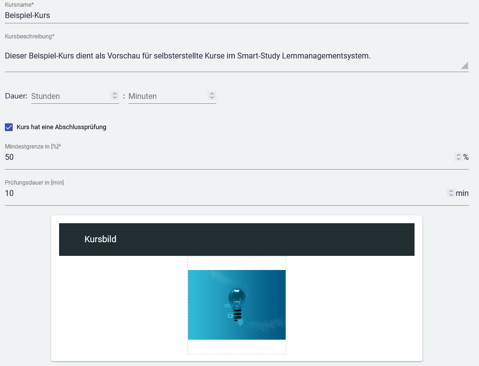 Ein Bild laden Sie entweder über Ihren Rechner oder den systemeigenen Datei-Manager hoch. Auch die Dauer des Kurses können Sie hier eintragen.