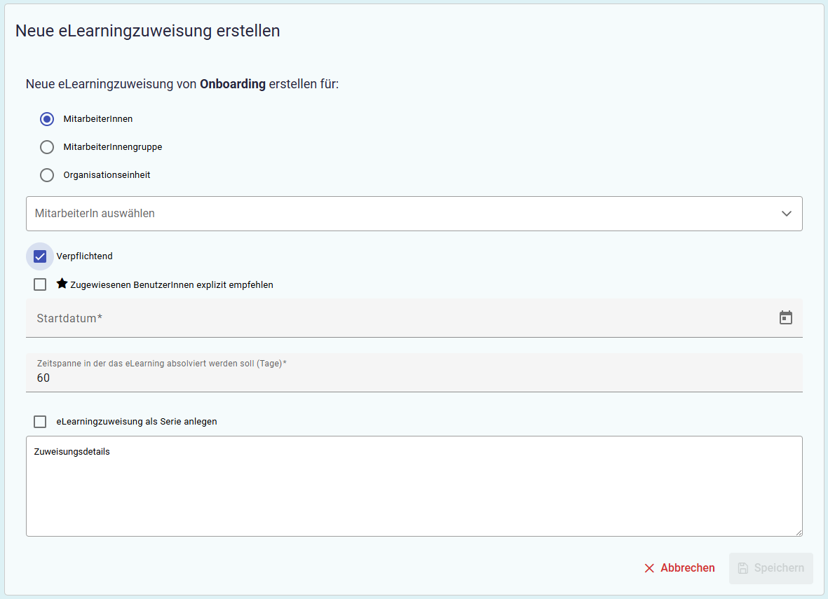 Es besteht die Möglichkeit den Kurs einzelnen MitarbeiterInnen, MitarbeiterInnengruppen oder Organisationseinheiten zuzuweisen.
