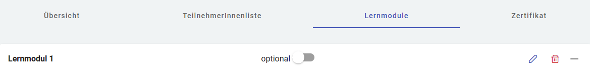 Mit dem Bleistift-Icon rechts können Sie Name und Beschreibung des Moduls bearbeiten. Mit dem Mülleimer-Icon können Sie das Modul löschen. Mit der Minus-/Plus-Schaltfläche können Sie Module ein- und ausklappen, um bei umfangreicheren Lernpfaden den Überblick zu behalten.