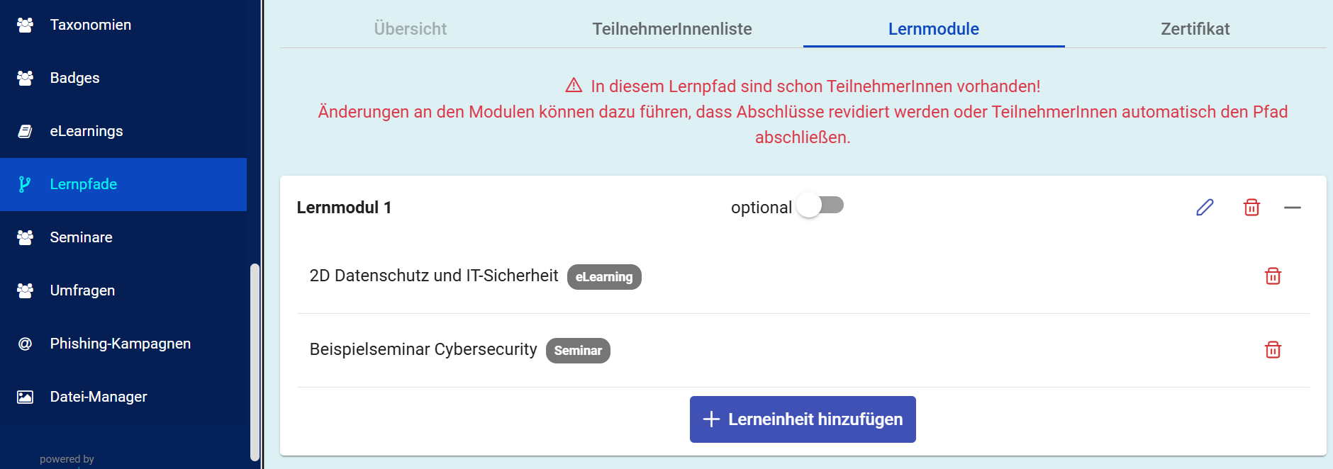 Wenn ein Lernpfad bereits Abschlüsse bzw. TeilnehmerInnen aufweist, wird eine Warnung angezeigt, dass in diesem Lernpfad schon TeilnehmerInnen vorhanden sind und, dass Änderungen an den Modulen zur Revision von Abschlüssen bzw. zum automatischen Abschluss des Lernpfades führen könnten: