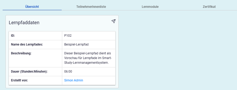Das Lernpfadprofil beginnt mit dem Menüpunkt Übersicht. Auf den ersten Blick erhalten Sie hier die wichtigsten Lernpfad-Daten: die Lernpfad-ID, den Namen des Lernpfades, die Beschreibung und die Dauer in Stunden und Minuten. Zudem finden Sie hier den Namen der Person, die den Lernpfad erstellt hat und eine Liste von Ansprechpersonen.