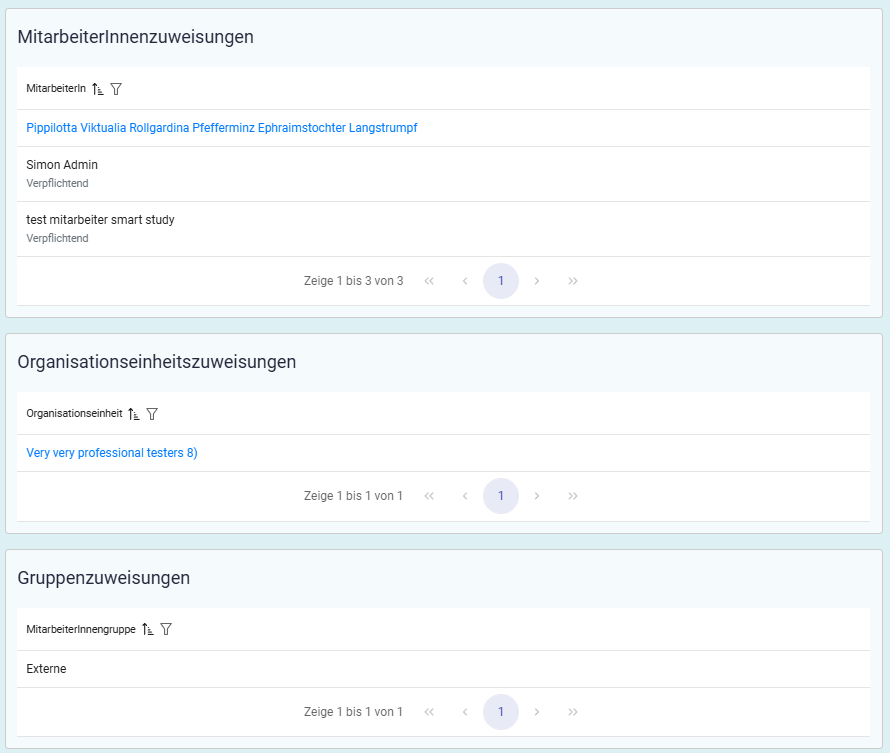 Unterhalb der ‘Lernpfaddaten’ wird angezeigt, welchen MitarbeiterInnen, Organisationseinheiten oder Gruppen der Lernpfad zugewiesen wurde. Auch globale Zuweisungen an alle MitarbeiterInnen der Organisation werden hier angezeigt.
