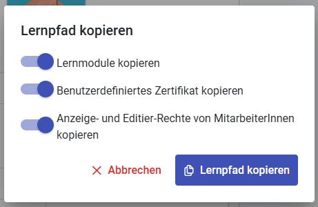 Mittels des “Kopieren”-Icons, das sowohl in der Lernpfad-Liste als auch in der Lernpfad-Übersicht zu finden ist, kann ein Lernpfad kopiert werden. So kann zeiteffizient ein neuer Lernpfad auf Basis eines bestehenden erstellt werden.