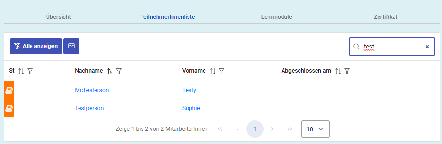 Klicken Sie in der Lernpfad-Übersicht auf den Tabellenreiter ‘TeilnehmerInnenliste’, können Sie eine Liste aller Mitarbeitenden sehen, denen dieser Lernpfad zugewiesen wurde. Bei Teilnehmenden, die den Lernpfad bereits absolviert haben, sehen Sie das Datum unter ‘Abgeschlossen am’. Die Liste kann wie gewohnt nach Belieben gefiltert oder sortiert werden. Ebenso können Sie mit dem ‘Suchen…’-Feld gezielt nach Mitarbeitenden suchen.