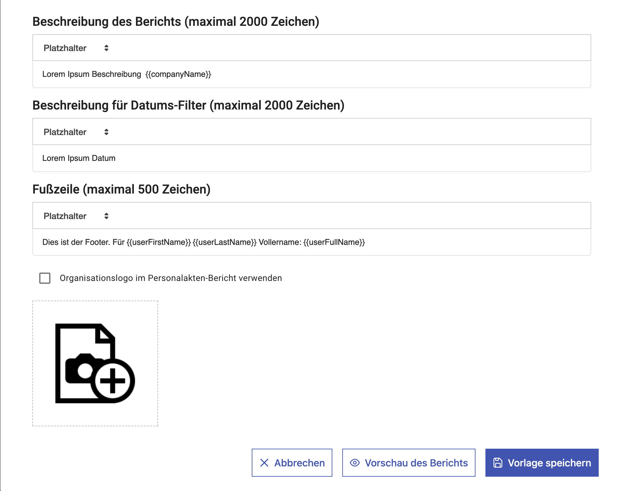 Mit der Funktion Vorschau des Berichts kann die Dokumentenvorlage angezeigt und überprüft werden. Dies umfasst die Darstellung des Berichts sowie die korrekte Platzierung und Funktionsweise der verwendeten Platzhalter.