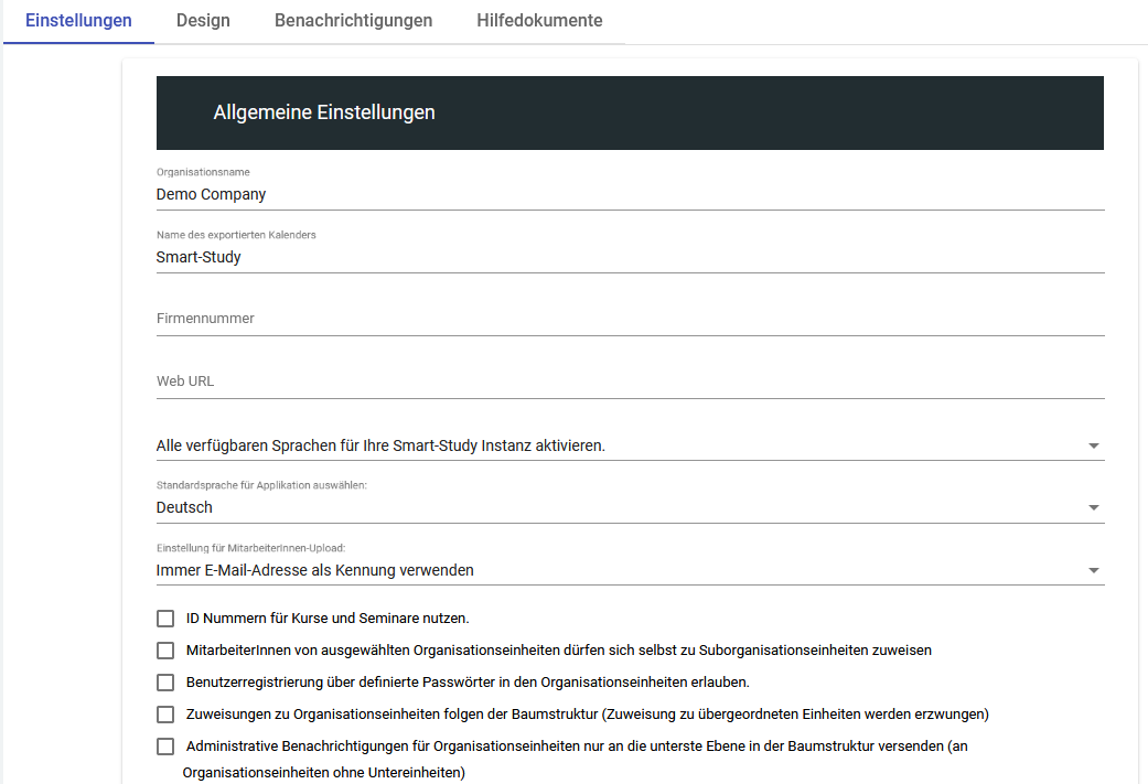 In dem Bereich Allgemeine Einstellungen können Organisationsname", Firmennummer" und die Web URL" eingefügt oder geändert werden. Sie können festlegen, welche Sprachen" in Ihrem System aktiviert werden sollen. Die Standardsprache" kann ebenfalls umgestellt werden.