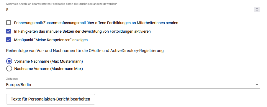 Mit Reihenfolge von Vor- und Nachnamen für die OAuth- und ActiveDirectory-Registrierung wird geregelt, wie das Feld Vollständiger Name bei Mitarbeitenden zusammengesetzt wird. Bitte beachten Sie, dass eine Änderung dieser Einstellung keinen Einfluss auf bereits bestehende Mitarbeitende hat.