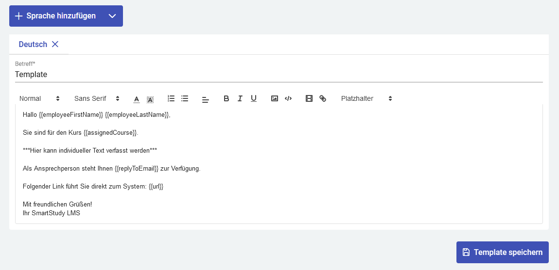 Verfassen und formatieren Sie Benachrichtigungen mit dem Editor. Um Daten dynamisch in die Benachrichtigung laden zu können, benötigen Sie Platzhalter. Sie finden alle verfügbaren in der Menüleiste unter Platzhalter. Nach Auswahl des gewünschten Platzhalters erscheint dieser an der Stelle, an der sich Ihr Cursor zurzeit befindet. So platzieren Sie die Platzhalter an jeder beliebigen Stelle in der E-Mail.