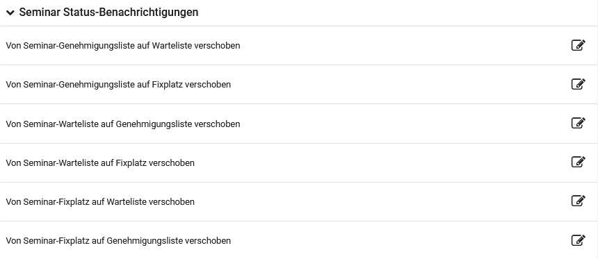 Bei diesen Benachrichtigungen geht es um Mails, die Teilnehmende erhalten, wenn sie zu einer der Listen, also Genehmigungs-, Warte- oder Abmeldeliste, verschoben werden. Es gibt Benachrichtigungen für folgende Seminar-Statusänderungen: