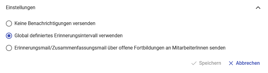 Es kann eine Erinnerungsbenachrichtigung für MitarbeiterInnen eingerichtet werden, wobei festgelegt werden kann, wie viele Tage vor Ablauf der Kurszuweisung die Benachrichtigung erfolgen soll.