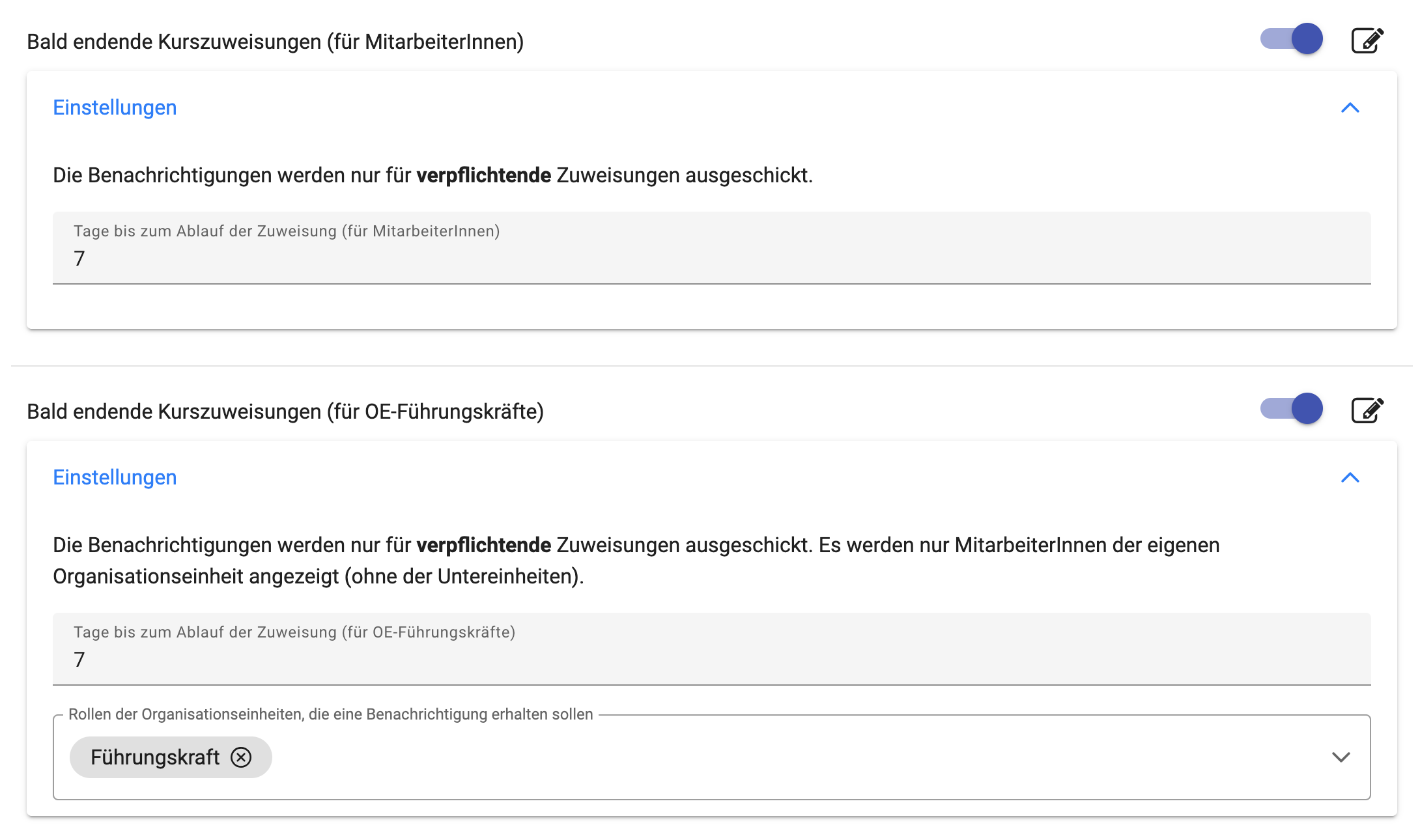 Es besteht weiters die Möglichkeit, Erinnerungsemails für bald endende Kurszuweisungen zu konfigurieren. Diese Benachrichtigungen können für MitarbeiterInnen und Führungskräfte, die personalverwaltende Stelle und/oder OE-AdministratorInnen aktiviert werden. Der Versand erfolgt innerhalb eines individuell festgelegten Zeitraums vor Ablauf der Kurszuweisung.