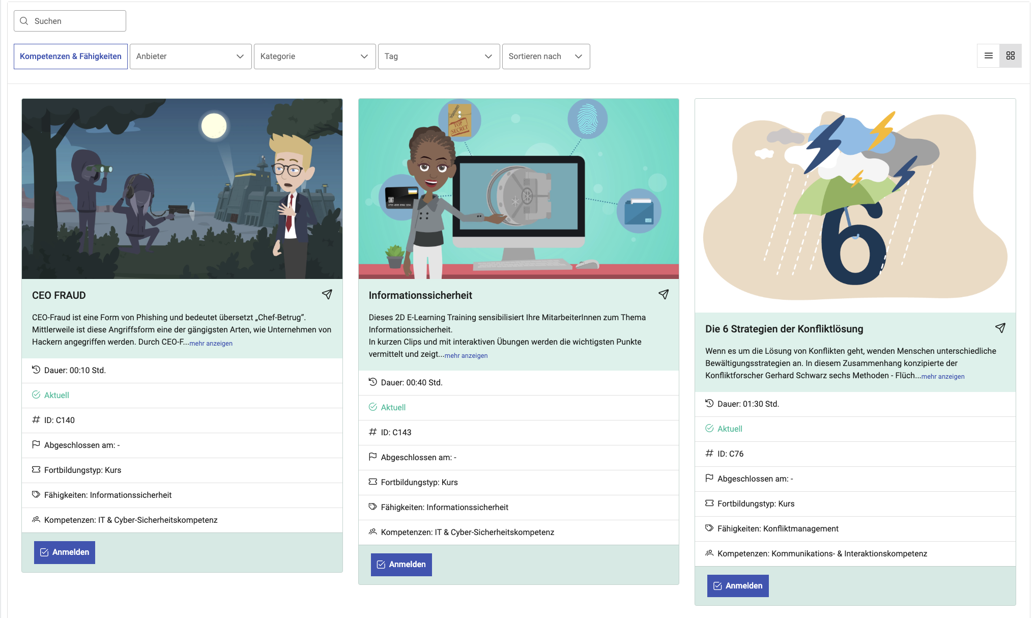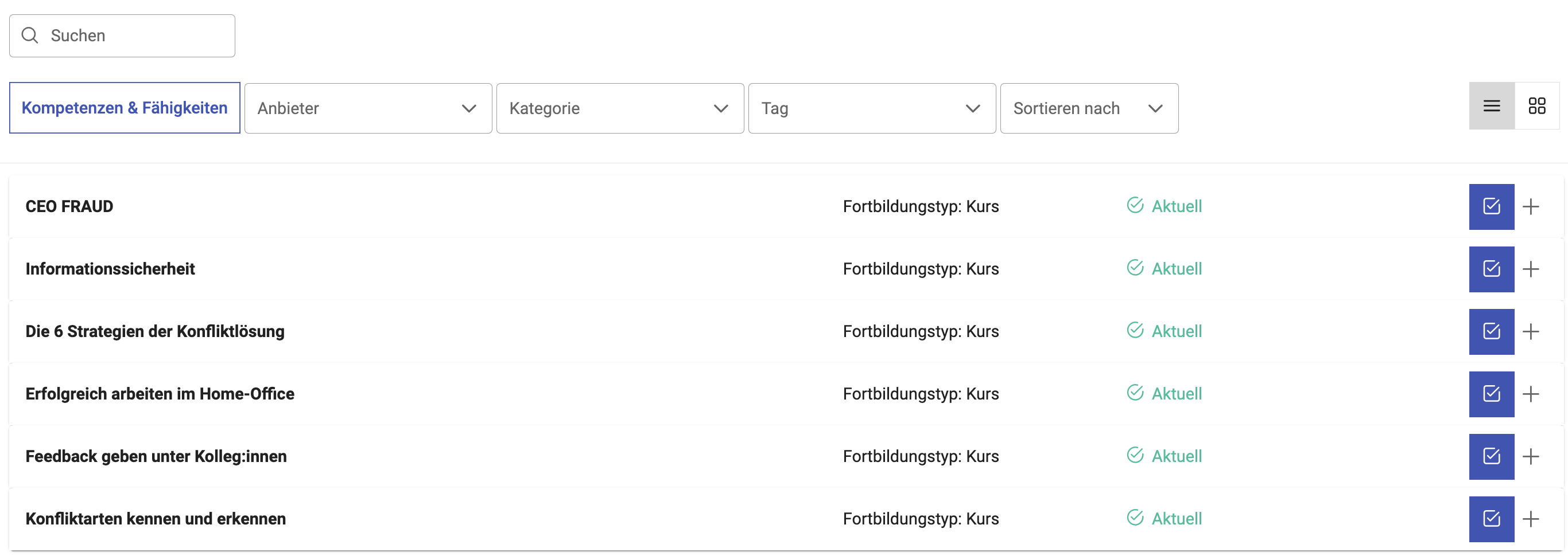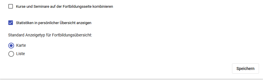 Auch der Anzeigetyp für die Fortbildungsübersicht kann geändert werden. Sie haben hier die Optionen für eine Karten- oder eine Listenansicht.