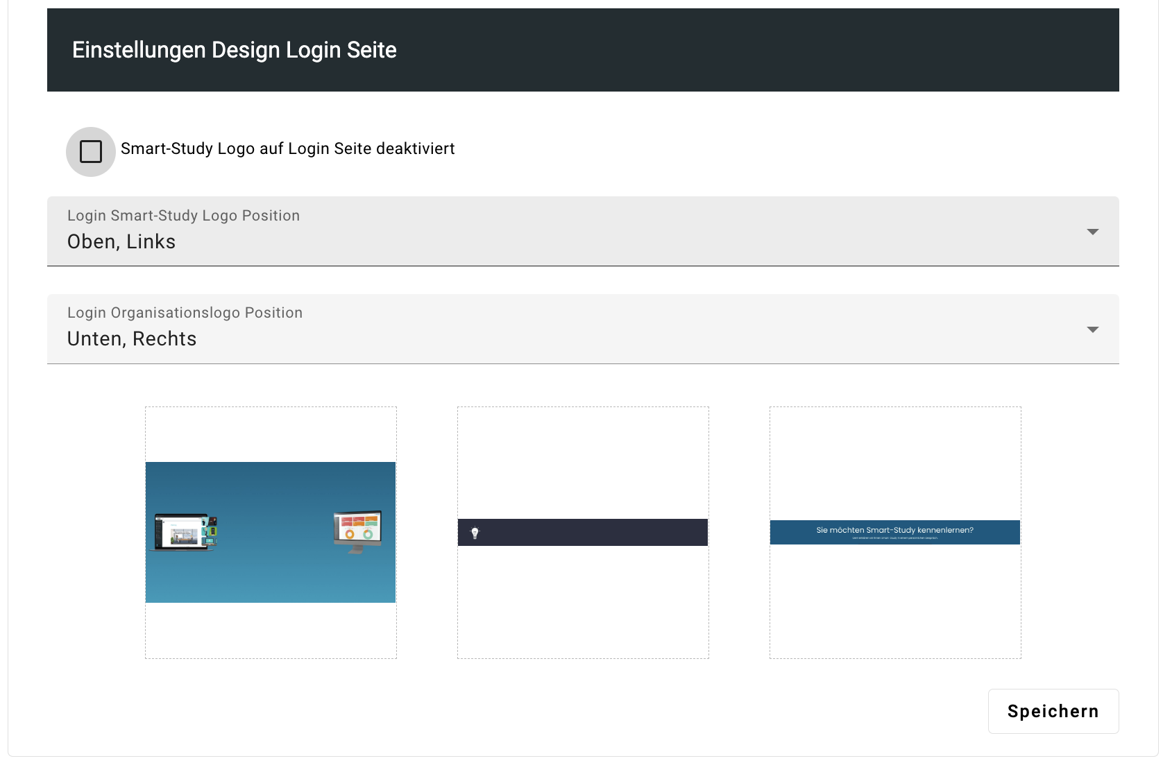 In diesem Reiter finden Sie die Möglichkeit das Organisationslogo einzufügen bzw. zu ändern. Ebenfalls können Sie das voreingestellte Farbdesign nach Belieben anpassen. Ist ein Logo eingefügt wird dieses im Banner oben rechts (bei aktivierter Einstellung) wie auch auf der Login-Seite unten links (je nach Einstellung) angezeigt.