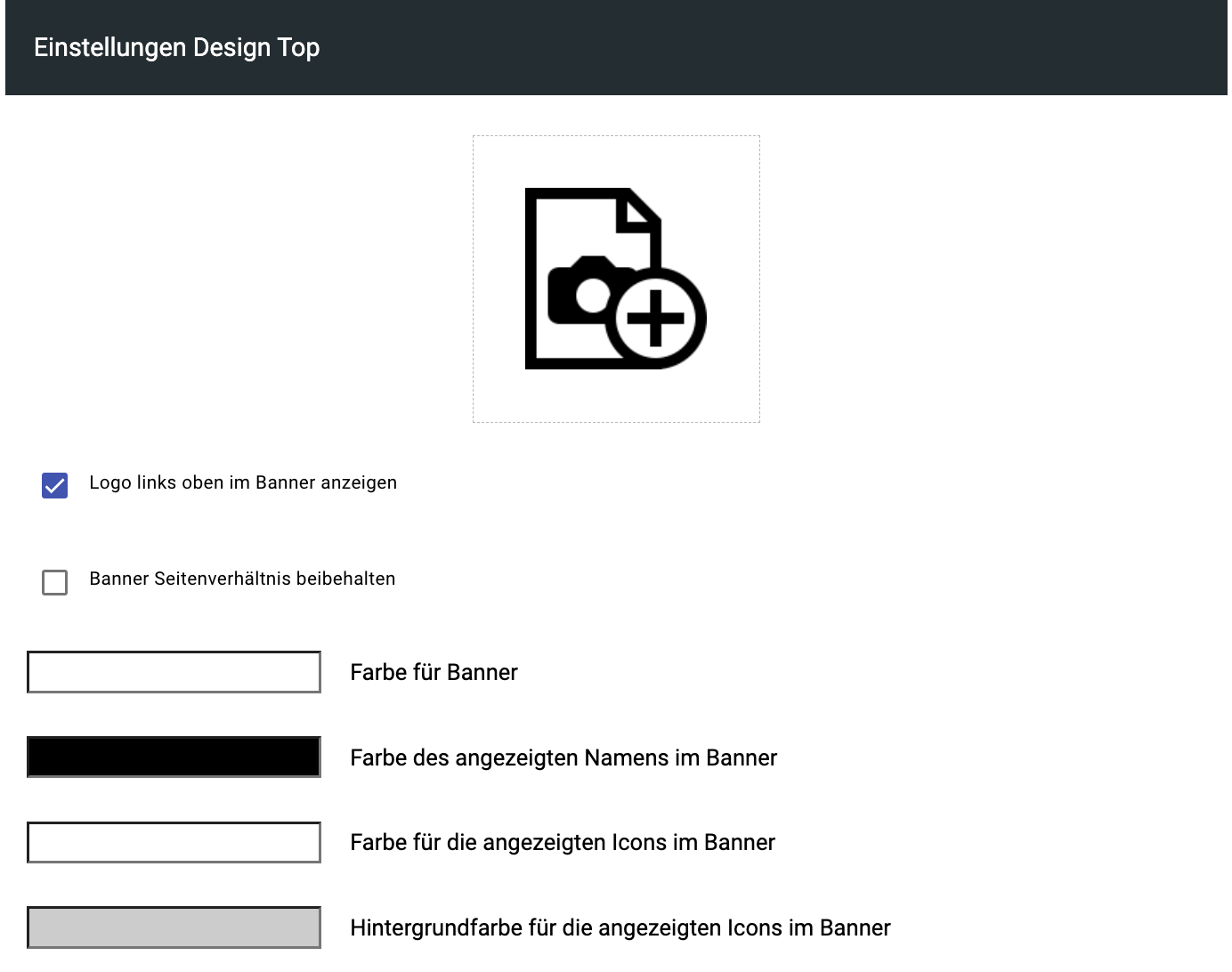 Ebenfalls kann hier das Logo links oben im Banner aktiviert werden und das Seitenverhältnis des hochgeladenen Banners beibehalten werden. Wenn das Seitenverhältnis beibehalten wird, wird die hochgeladene Datei in ihrer ursprünglichen Größe dargestellt. Dies kann Verzerrungen vermeiden, jedoch möglicherweise weiße Ränder im Banner erzeugen.