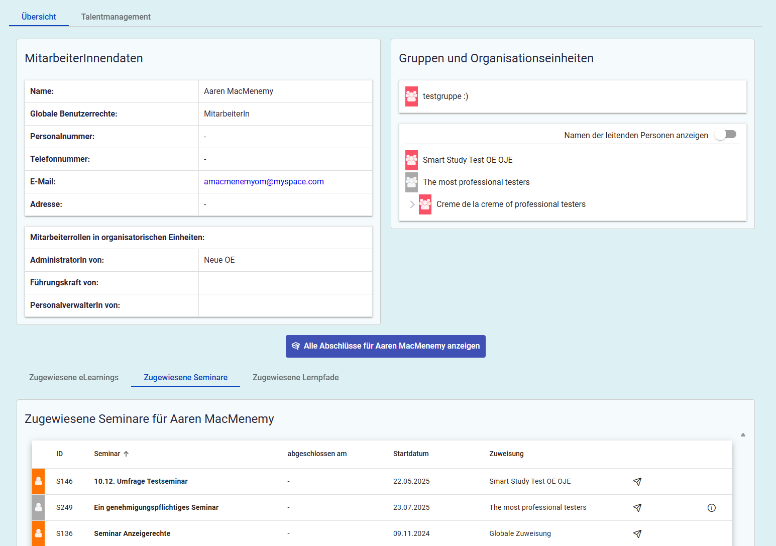 Über den Button Alle Abschlüsse für xxxxxx anzeigen kommen Sie zu einer Liste mit den Kurs-, Seminar- und Lernpfadabschlüssen der Mitarbeitenden.
