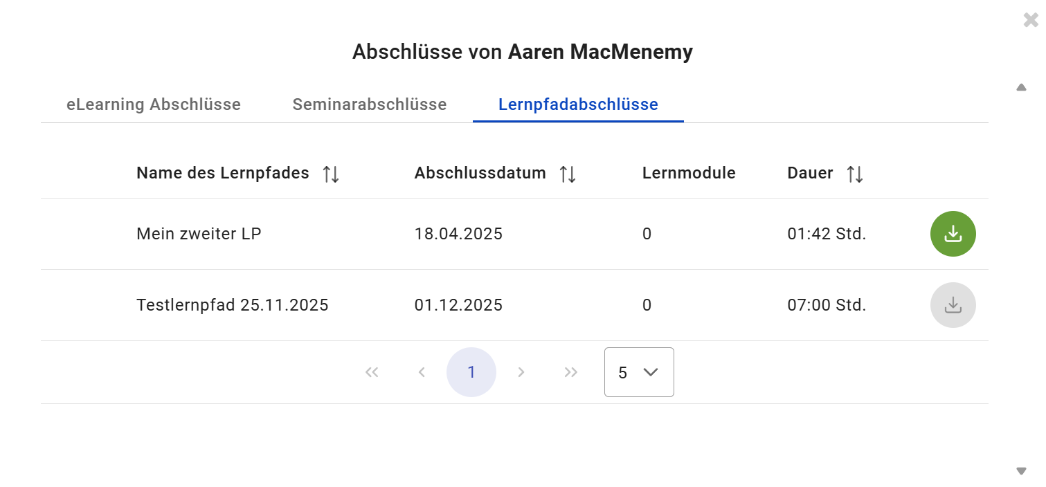 Mit einem Klick auf Alle Abschlüsse für xxxxxx anzeigen können Sie in die Abschlüsse und Zertifikate einer Person Einblick nehmen und diese downloaden. Zum Download eines Zertifikats klicken Sie bitte auf den runden, grünen Button. Ist dieser ausgegraut, wurde für die Fortbildung kein Zertifikat vergeben.