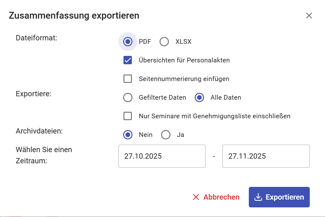 Zusätzlich können Sie hier einen Zeitraum wählen. Für den Export werden nur Kurse und Seminare berücksichtigt, die im betroffenen Zeitraum abgeschlossen wurden.