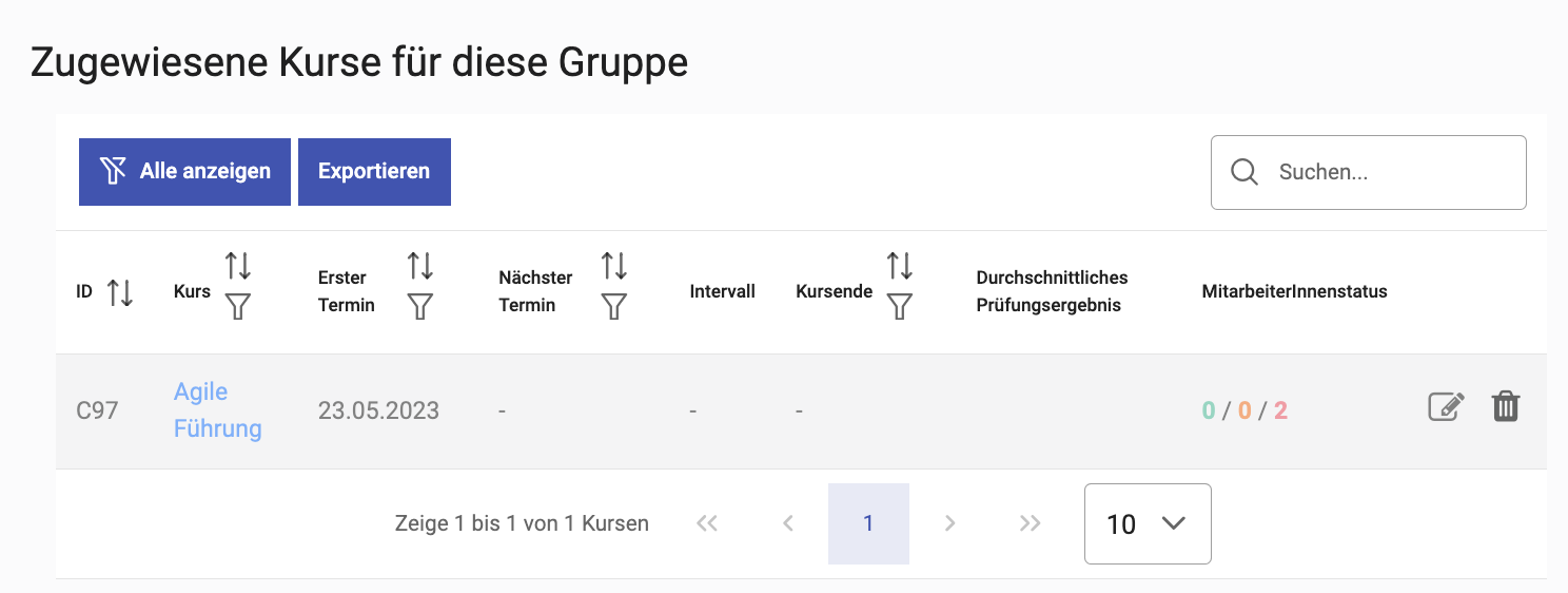 Ganz rechts gibt es das Stift-Symbol zur Änderung der Zuweisungen und den Papierkorb um eine zugewiesene Fortbildung zu entfernen. Die Fortbildung wird dabei nicht aus dem System gelöscht, sondern lediglich die Zuweisung zur MitarbeiterInnengruppe. MitarbeiterInnen, die eine entfernte Fortbildung bereits abgeschlossen haben, sehen diese auch nicht mehr im Menüpunkt Fortbildungen, behalten aber das erworbene Zertifikat.