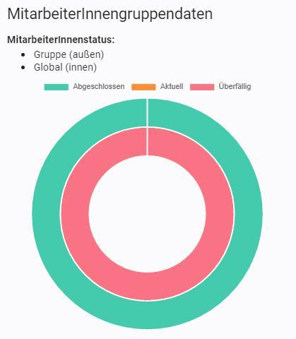 Wurden Fortbildungen bereits absolviert, wird das durchschnittliche Ergebnis angezeigt. Daneben gibt es, farblich codiert, einen Überblick über den Status aller MitarbeiterInnen (abgeschlossen, offen, überfällig). Sind MitarbeiterInnen vorhanden, so können Sie auf den Status klicken und sehen die TeilnehmerInnenliste sortiert in den einzelne Staus.