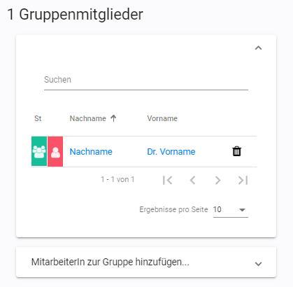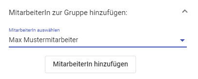 Darunter können Sie mit einem Klick auf MitarbeiterIn zur Gruppe hinzufügen Mitarbeitende der Gruppe zuweisen.