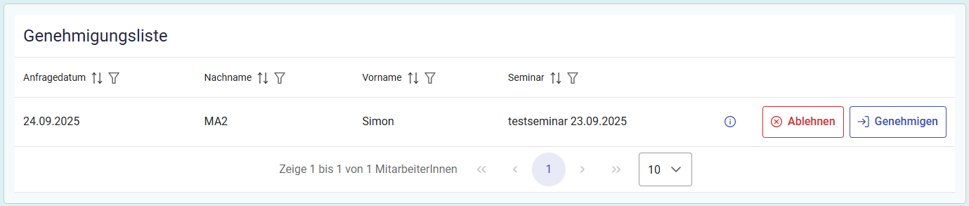 In der Genehmigungsliste kann man jene MitarbeiterInnen sehen, die auf eine Genehmigung für ein Seminar warten. Auf die Liste kommen Mitarbeitende, die sich für ein Seminar anmelden, das eine Genehmigungsliste aktiviert hat.