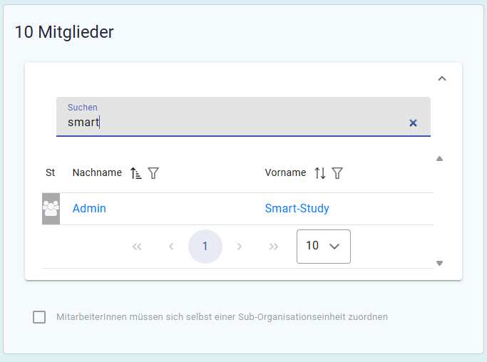 Rechts daneben gibt es eine Übersicht über die Mitglieder der Organisationseinheit. Diese Liste lässt sich alphabetisch nach dem Vor- oder Nachnamen sortieren und kann auch mithilfe einer Suchfunktion durchsucht werden.