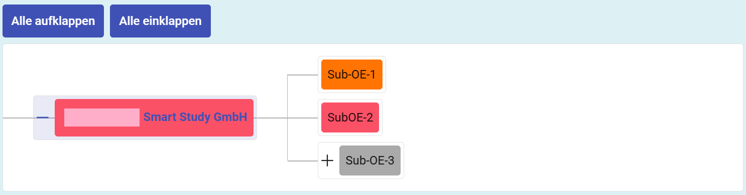 In der Übersicht erscheint ganz oben die Organisationsstruktur mit ihren Suborganisationseinheiten. Diese Anzeige lässt sich mit den Buttons Alle aufklappen und Alle einklappen verändern. Alternativ können Sie die Struktur auch über die Plus und Minus Symbole im linken Bereich der jeweiligen Einheit auf- bzw. einklappen. Ein Klick auf eine aufgeklappte Subeinheit führt zur deren Übersicht. Die aktuell ausgewählte Organisationseinheit ist farblich (Schrift in blau) markiert.