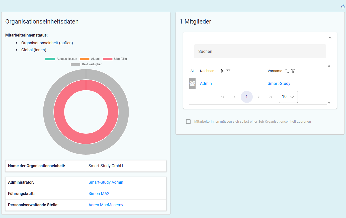 Weiter unten erscheinen die Organisationseinheitsdaten. Diese bieten eine Übersicht über den MitarbeiterInnenstatus, welcher farblich codiert ist. Für alle abgeschlossenen, offenen und überfälligen Kurse gibt es jeweils eine eigene Farbe. Diese wird in den allgemeinen Einstellungen im Menüreiter „Design" festgelegt. Der äußere Kreis des Diagramms stellt den durchschnittlichen Status der Mitarbeitenden innerhalb dieser Organisation dar. Der innere Kreis zeigt zum Vergleich den globalen MitarbeiterInnen-Status aller NutzerInnen im System.