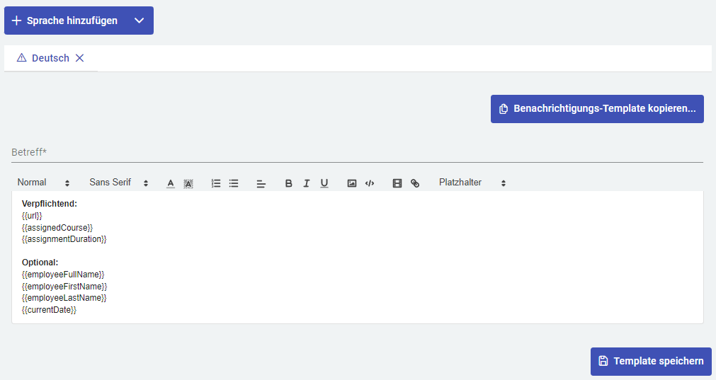Mit Benachrichtigungstemplate kopieren können Sie ein vorhandenes Template kopieren und in Ihre Vorlage einfügen. Sie können dieses dann weiter bearbeiten.
