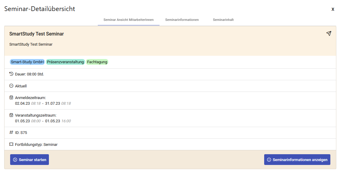 Mit einem Klick auf das Info-Symbol rechts oben im Seminarprofil gelangen Sie zur Seminar-Vorschau. Hier sehen Sie das Seminar wie es sich für die MitarbeiterInnen im Fortbildungsangebot darstellt.
