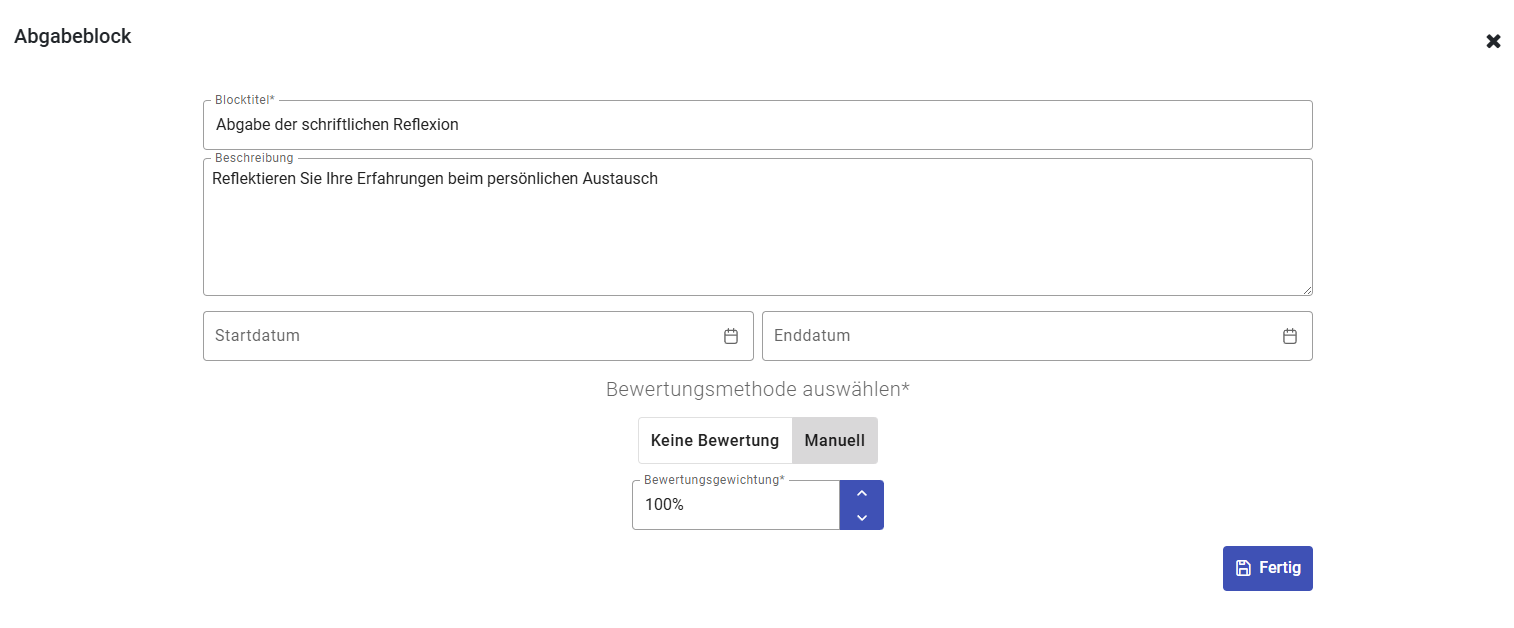 Mit dem Abgabeblock können Sie festlegen, dass die Seminarteilnehmenden eine Abgabe hochladen müssen. Im Titel und der Beschreibung können Sie die Aufgabe erklären. Es kann eingestellt werden, ob die Abgabe eine manuelle oder keine Bewertung haben soll. Wird eine manuelle Bewertung verwendet, müssen Sie eine Bewertungsgewichtung für den Abgabeblock eintragen.