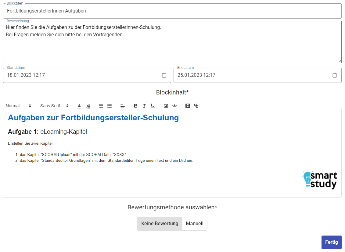 Der Editorblock ermöglicht es Ihnen, Inhalte zu verfassen. Sie können unter anderem Links, Bilder und Videos einfügen. Es kann eingestellt werden, ob dieser Block eine manuelle oder keine Bewertung haben soll.