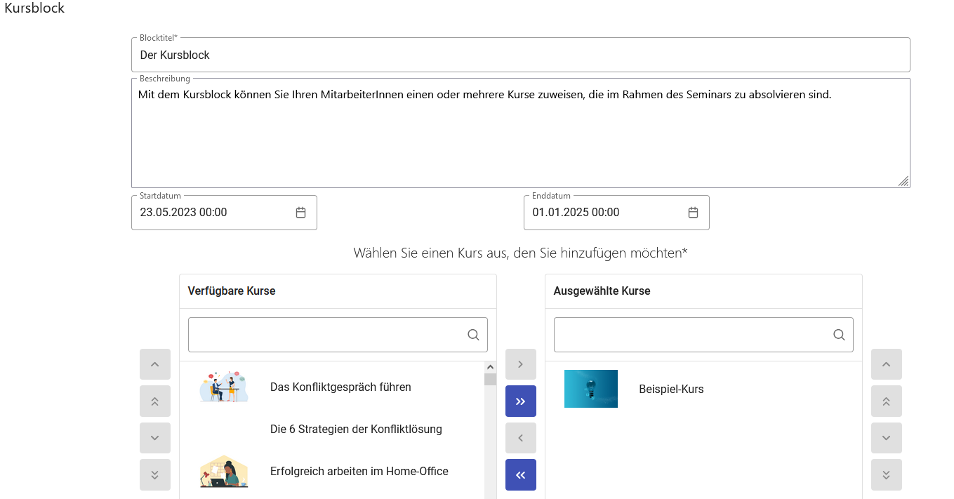 Der Kurs-Block erlaubt es, Kurse hinzuzufügen, die für die erfolgreiche Absolvierung des Seminars erforderlich sind. Wählen Sie einen Kurs auf der linken Seite aus und klicken Sie auf den obersten Pfeil. Es kann eingestellt werden, ob der Kurs-Block eine automatische, manuelle oder keine Bewertung haben soll.