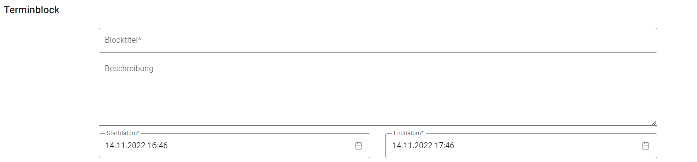 Es gibt 5 verschiedene Arten von Blöcken. Für jeden Block muss neben dem Titel auch ein Start- und Enddatum festgelegt werden.
