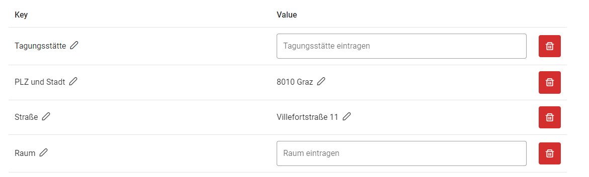 Im unteren Teil können Sie angeben, wo dieser Termin stattfindet. Dafür können Sie entweder eine Adresse angegeben oder zum Beispiel auch ein Skype-Link in den passenden Schlüssel kopiert werden. Damit Sie den Block speichern können, müssen Sie all jene Schlüssel, die Sie nicht benötigen, zuerst löschen.