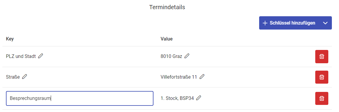 Finden Sie Ihren gewünschten Schlüssel nicht in der Auswahl, können Sie über den Button ‘Schlüssel hinzufügen’ einen neuen ergänzen. Dafür müssen Sie nur den Namen sowie den Wert des Schlüssels angeben.