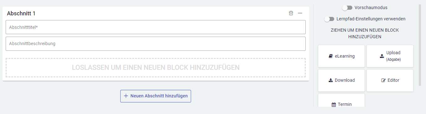 Sie können ein Seminar in Abschnitte unterteilen, die wiederum mehrere Blöcke beinhalten können. Um einen neuen Abschnitt hinzuzufügen, klicken Sie auf den Button ‘Neuen Abschnitt hinzufügen’. Dort müssen Sie einen Abschnittstitel eintragen und können eine Abschnittsbeschreibung einfügen. Für die Benennung eines hinzugefügten Abschnittes stehen Ihnen im Abschnittstitel maximal 100 Zeichen zur Verfügung. Im untersten Feld können Sie mithilfe der Blöcke auf der rechten Seite Inhalte einfügen.