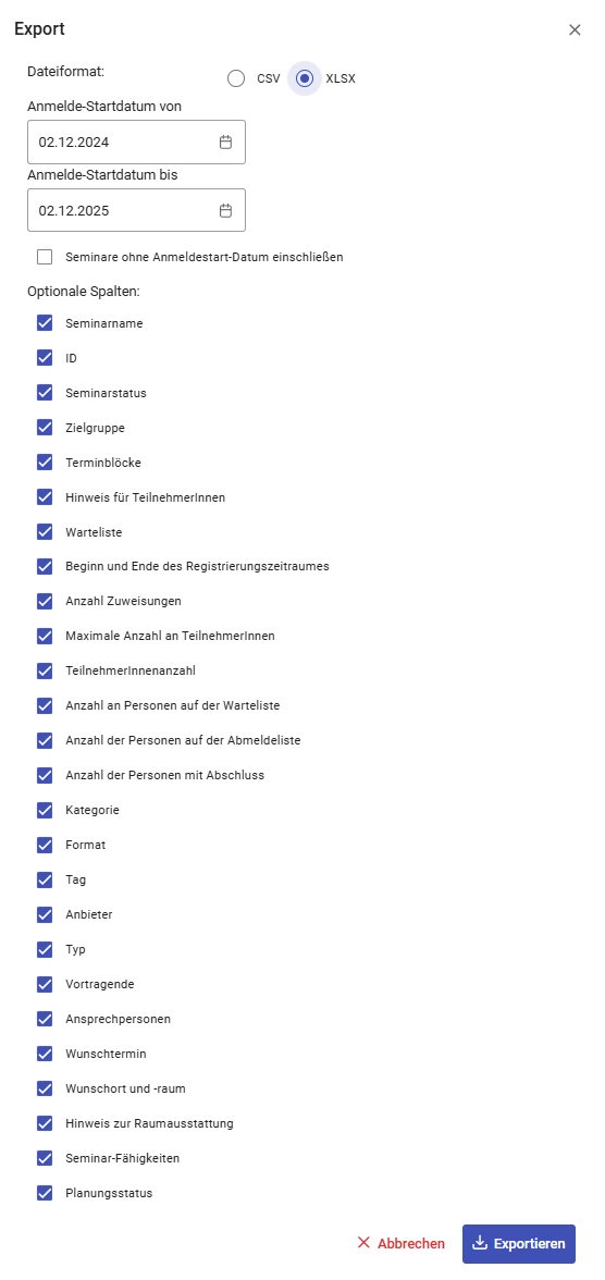Über den Button Exportieren können Sie Informationen zu Seminaren exportieren.