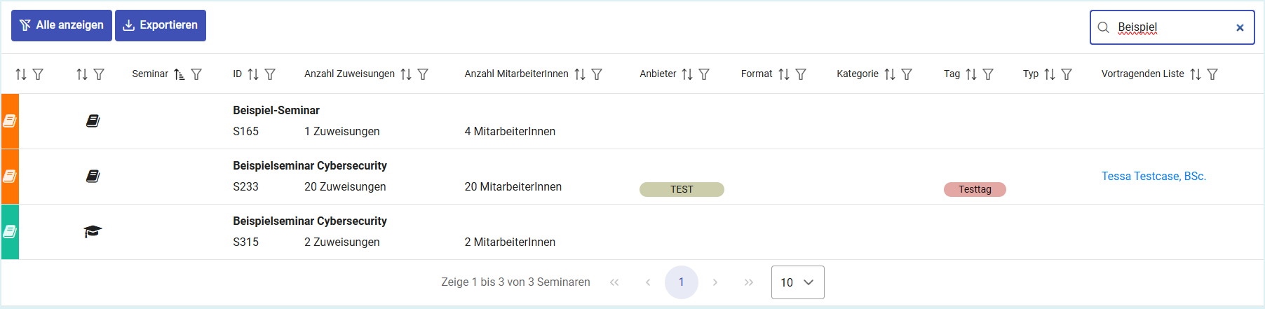 Über der Liste kann die Anzeige der Seminare mithilfe eines Dropdown-Menüs eingeschränkt werden. Dabei kann ausgewählt werden, ob alle Seminare oder nur bestimmte Kategorien angezeigt werden sollen, wie beispielsweise buchbare Seminare, Seminare in Planung, in Vorbereitung, im Entwurf oder archivierte Seminare.