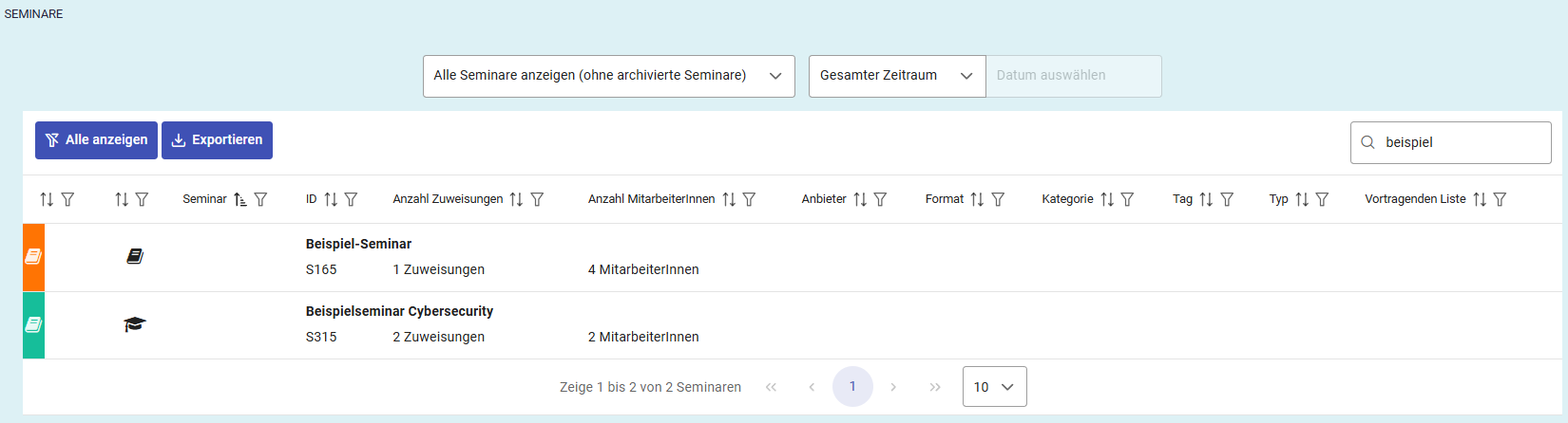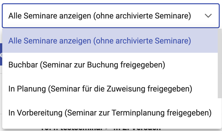 Über der Liste kann die Anzeige der Seminare mithilfe eines Dropdown-Menüs eingeschränkt werden. Dabei kann ausgewählt werden, ob alle Seminare oder nur bestimmte Kategorien angezeigt werden sollen, wie beispielsweise buchbare Seminare, Seminare in Planung, in Vorbereitung, im Entwurf oder archivierte Seminare.