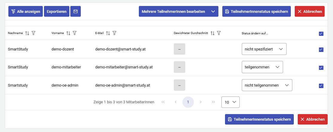 Sie können nun über den Button ‚Mehrere TeilnehmerInnen bearbeiten’, alle per Checkbox ausgewählten TeilnehmerInnen den Status „teilgenommen" vergeben. Wenn Sie die oberste Checkbox anklicken, wählen Sie alle TeilnehmerInnen aus. Falls TeilnehmerInnen nicht teilgenommen haben können Sie diese extra anwählen und Ihnen den Status „nicht teilgenommen" vergeben.