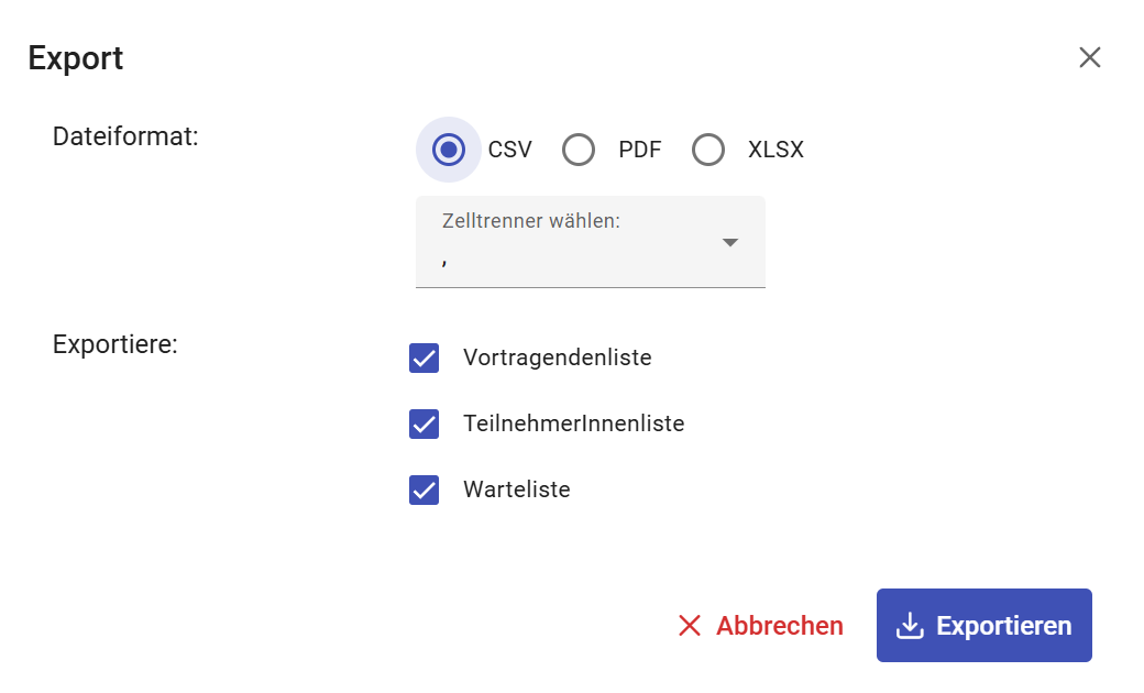 Hier müssen Sie im ersten Schritt das Dateiformat auswählen. Für .csv-Dateien können Sie einen Zelltrenner wählen. Darunter können Sie festlegen, ob Sie auch die Liste der Vortragenden, die TeilnehmerInnenliste bzw. Warteliste exportieren wollen.
