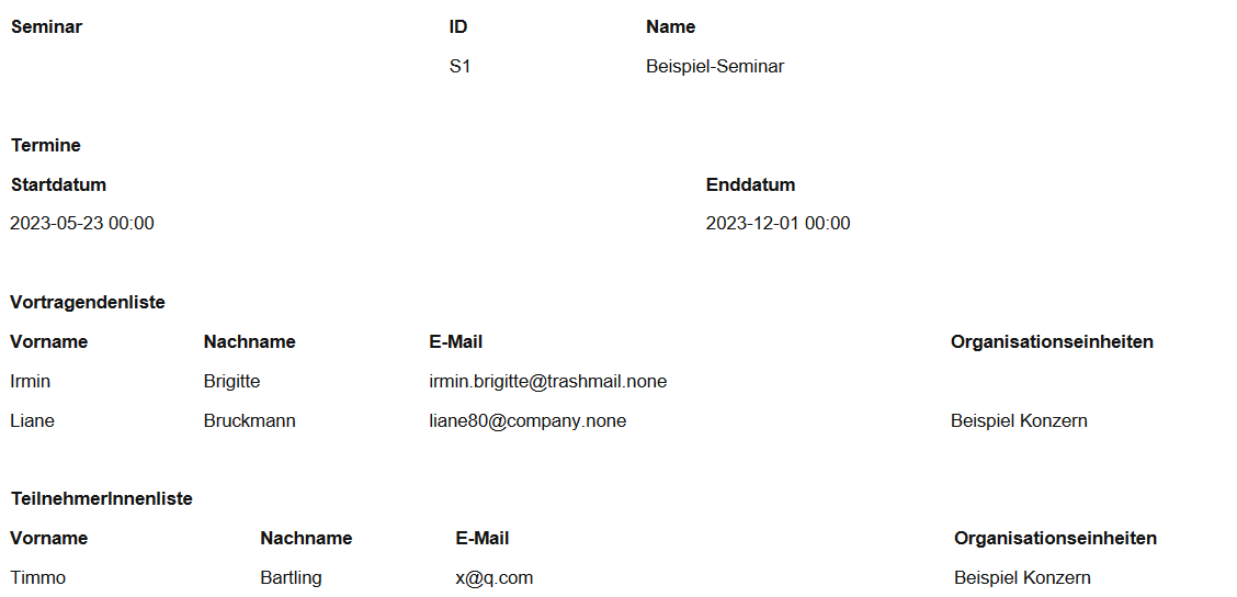 Bei Vortragenden und Teilnehmenden wird der Name, Nachname, die E-Mail-Adresse und die Organisationseinheit aufgeführt.