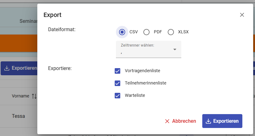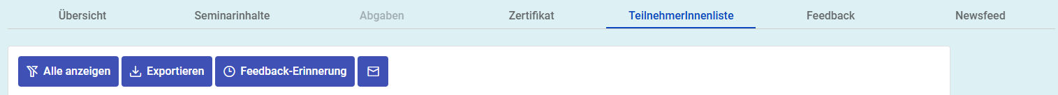 Über die Schaltfläche ‘Exportieren’ können Sie die TeilnehmerInnenliste des Seminars exportieren.