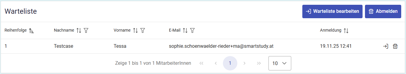 Hat ein Seminar eine limitierte TeilnehmerInnenzahl und wurde diese in Form von Anmeldungen überschritten, kommt der bzw. die Mitarbeitende auf die Warteliste. Wenn Plätze frei werden, melden Sie MitarbeiterInnen für das Seminar an, indem Sie auf den Pfeil rechts in der jeweiligen Zeile klicken und die Änderung speichern. Möchten Sie mehrere Personen auf der Warteliste für das Seminar anmelden, aktivieren Sie die Checkbox oben rechts ‚Alle von Warteliste verschieben’. Nun können Sie einzelne oder alle MitarbeiterInnen auswählen und mit ‚Ausgewählte von Warteliste verschieben’ für das Seminar anmelden.