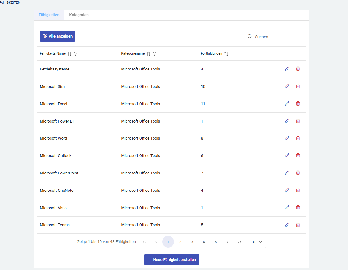 Durch den Alle anzeigen Button können nach einer Suche oder Filterung auf einen Klick wieder alle bereits erstellten und vorhandenen Fähigkeiten angezeigt werden.