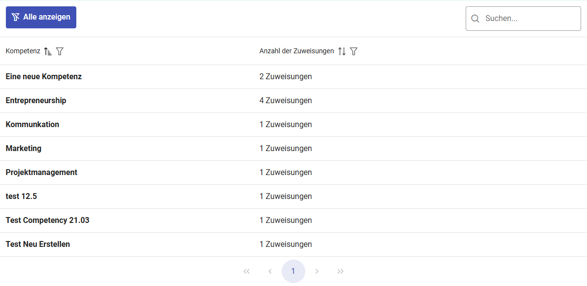 Kompetenzen erlauben es, erworbene Fähigkeiten im System darzustellen. Diese Kompetenzen können MitarbeiterInnen zugewiesen werden. Jede Kompetenz setzt sich aus mehreren spezifischen Fähigkeiten zusammen, die mit verschiedenen Fortbildungen verknüpft sind. Durch die Teilnahme an Kursen oder Schulungen erwerben Mitarbeitende die erforderlichen Fähigkeiten, wodurch ihre Kompetenz in diesem Bereich gestärkt wird. Sobald eine Kompetenz zugewiesen wurde, können Mitarbeitende einsehen, welche Fähigkeiten damit verbunden sind und welche Fortbildungen sie absolvieren müssen, um diese vollständig zu erwerben.