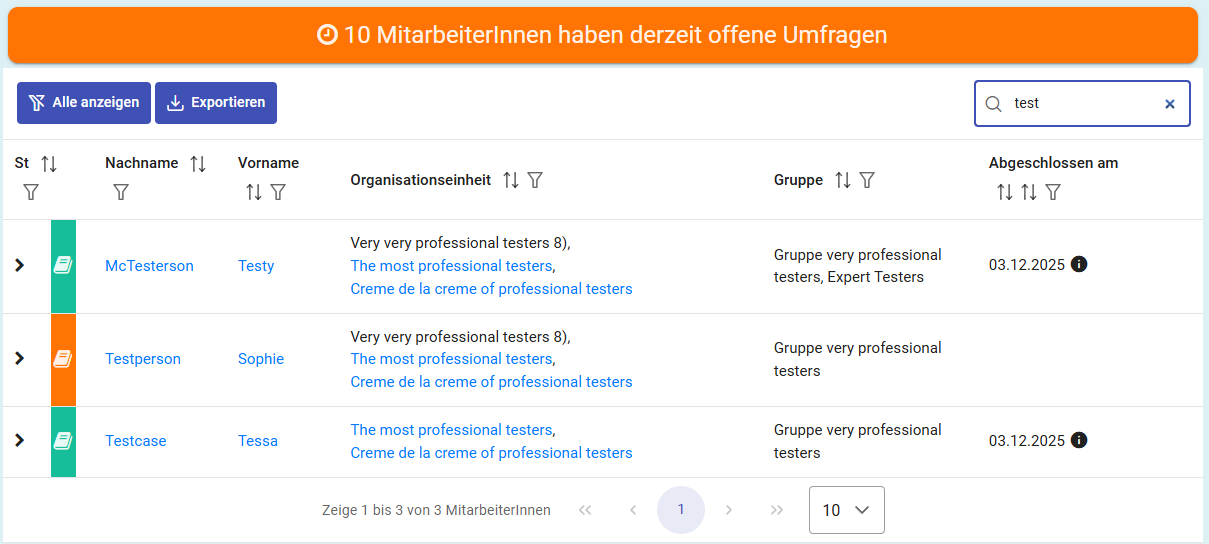 Klicken Sie in der Umfrage-Übersicht auf den Tabellenreiter “TeilnehmerInnenliste”, können Sie eine Liste aller Mitarbeitenden sehen, denen diese Umfrage zugewiesen wurde. Mitarbeitende, die Mitglied einer Organisationseinheit sind, in der Sie Führungskraft sind, verfügen über eine blaue Verlinkung zu ihrem MitarbeiterInnenprofil sowie zu den von Ihnen geführten Organisationseinheiten. Bei Teilnehmenden, die die Umfrage bereits absolviert haben, sehen Sie das Datum unter Abgeschlossen am. Die Liste kann wie gewohnt nach Belieben gefiltert oder sortiert werden. Ebenso können Sie mit dem “Suchen”-Feld gezielt nach Mitarbeitenden suchen.