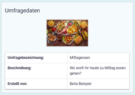 Das Umfrageprofil beginnt mit dem Menüpunkt Übersicht. Auf den ersten Blick erhalten Sie hier die wichtigsten Umfrage-Daten: Den Namen der Umfrage, die Beschreibung und den/die ErstellerIn.